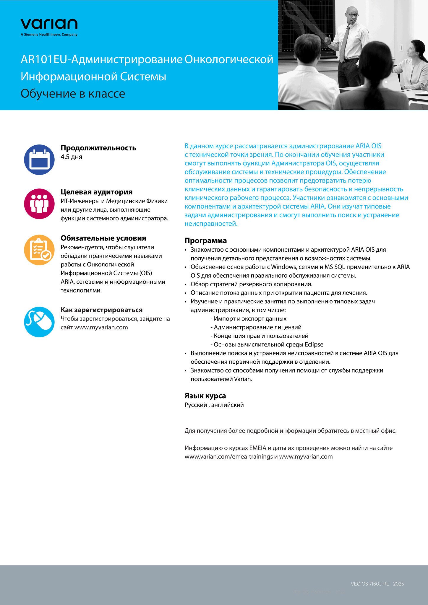 В данном курсе рассматривается администрирование ARIA OIS с технической точки зрения. По окончании обучения участники смогут выполнять функции Администратора OIS, осуществляя обслуживание системы и технические процедуры. Обеспечение оптимальности процессов позволит предотвратить потерю клинических данных и гарантировать безопасность и непрерывность клинического рабочего процесса. Участники ознакомятся с основными компонентами и архитектурой системы ARIA. Они изучат типовые задачи администрирования и смогут выполнить поиск и устранение неисправностей.