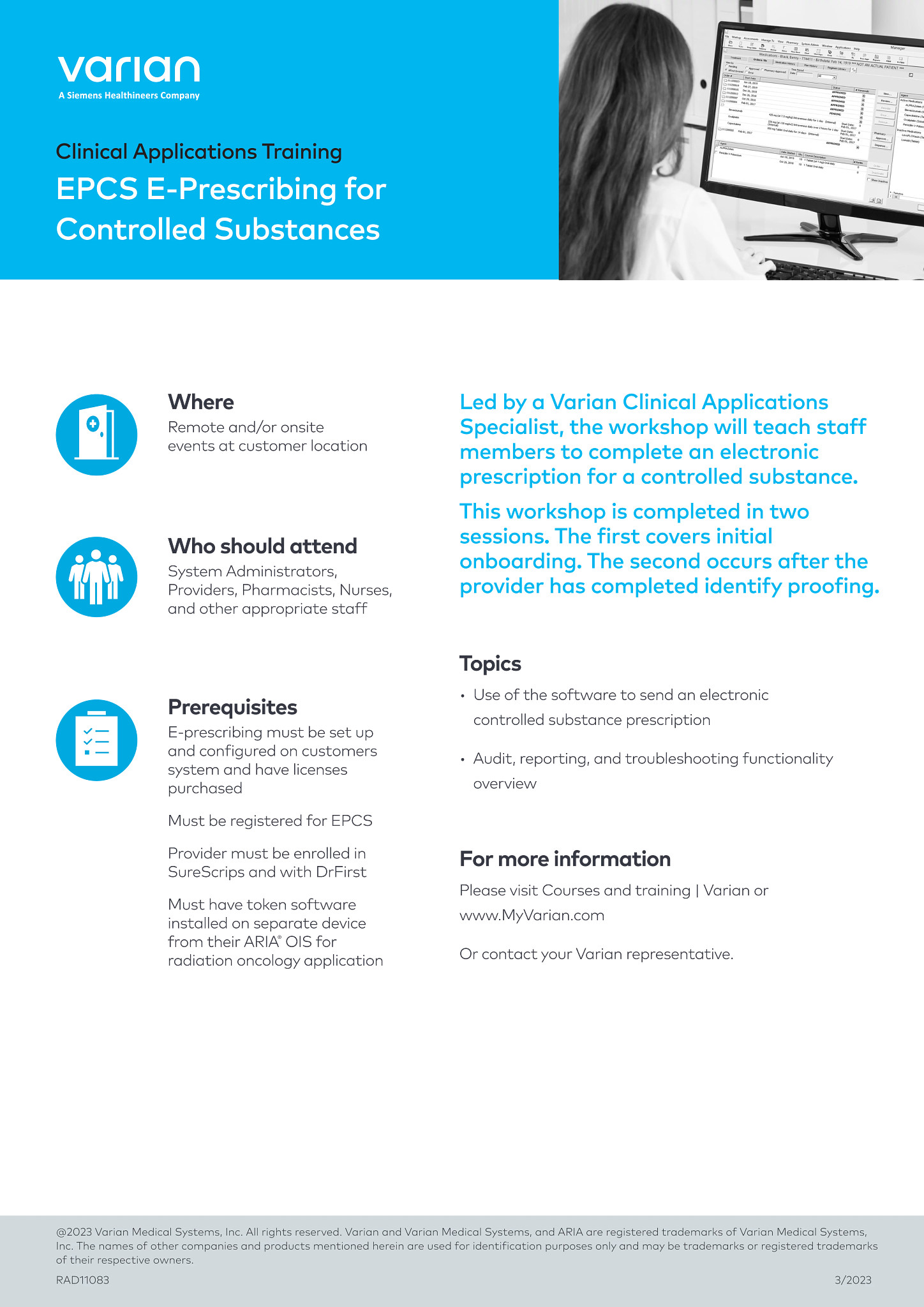 "courseDescription": "Led by a Varian Clinical Applications Specialist, the workshop will teach staff members to complete an electronic prescription for a controlled substance. This workshop is completed in two sessions. The first covers initial onboarding. The second occurs after the provider has completed identify proofing.",