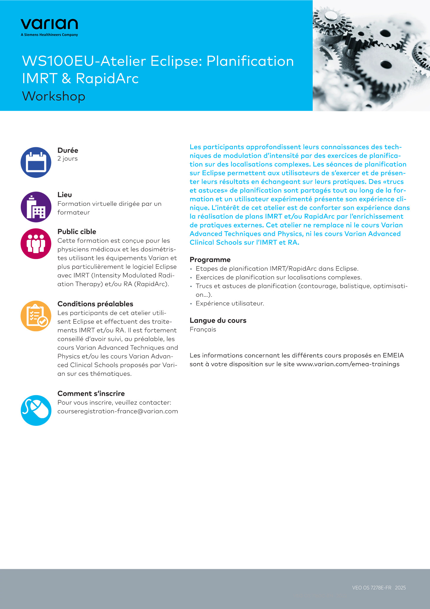 Cette formation est conçue pour les physiciens médicaux et les dosimétristes utilisant les équipements Varian et plus particulièrement le logiciel Eclipse avec IMRT (Intensity Modulated Radiation Therapy) et/ou RA (RapidArc).