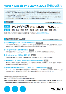 放射線治療装置及び関連システムを取り扱う株式会社バリアン メディカル システムズ(本社:東京都中央区、代表取締役:ケネス・タン)は、2022年8月28日(日)13時30分から17時30分にかけて、全国10カ所の会場をWebで繋ぎながら、医療関係者の皆様にVarianのいま(革新的ながん医療技術とソリューションの“最先端情報”)をお伝えする約4年ぶりの大規模現地開催イベント「Varian Oncology Summit 2022」を行います。「Varian Oncology Summit」では、各領域のExpertの先生方による、お使いの機器に関するTIPSの紹介やパネルディスカッションを行います。