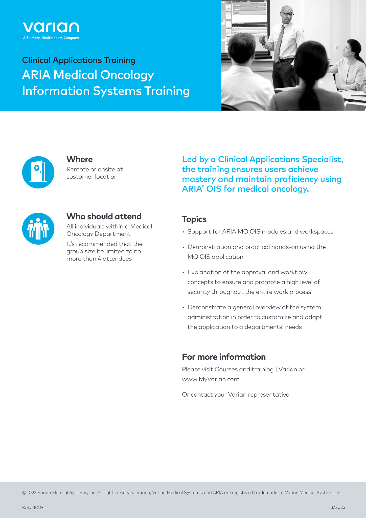Led by a Clinical Applications Specialist, the training ensures users achieve mastery and maintain proficiency using ARIA® OIS for medical oncology.