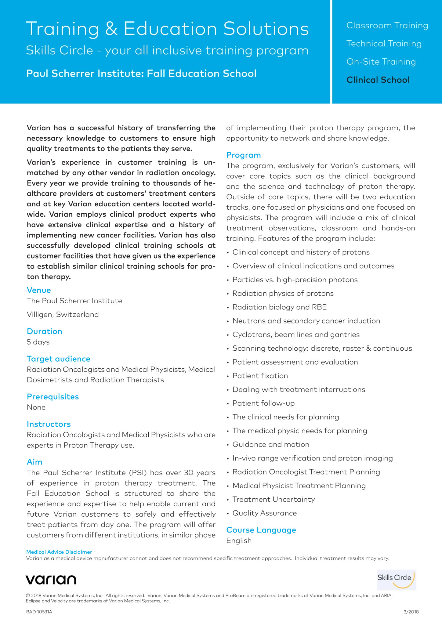 opportunity to network and share knowledge. Note: Classes will be scheduled based on interest; please email protonclinicalschool@varian.com for more information.",