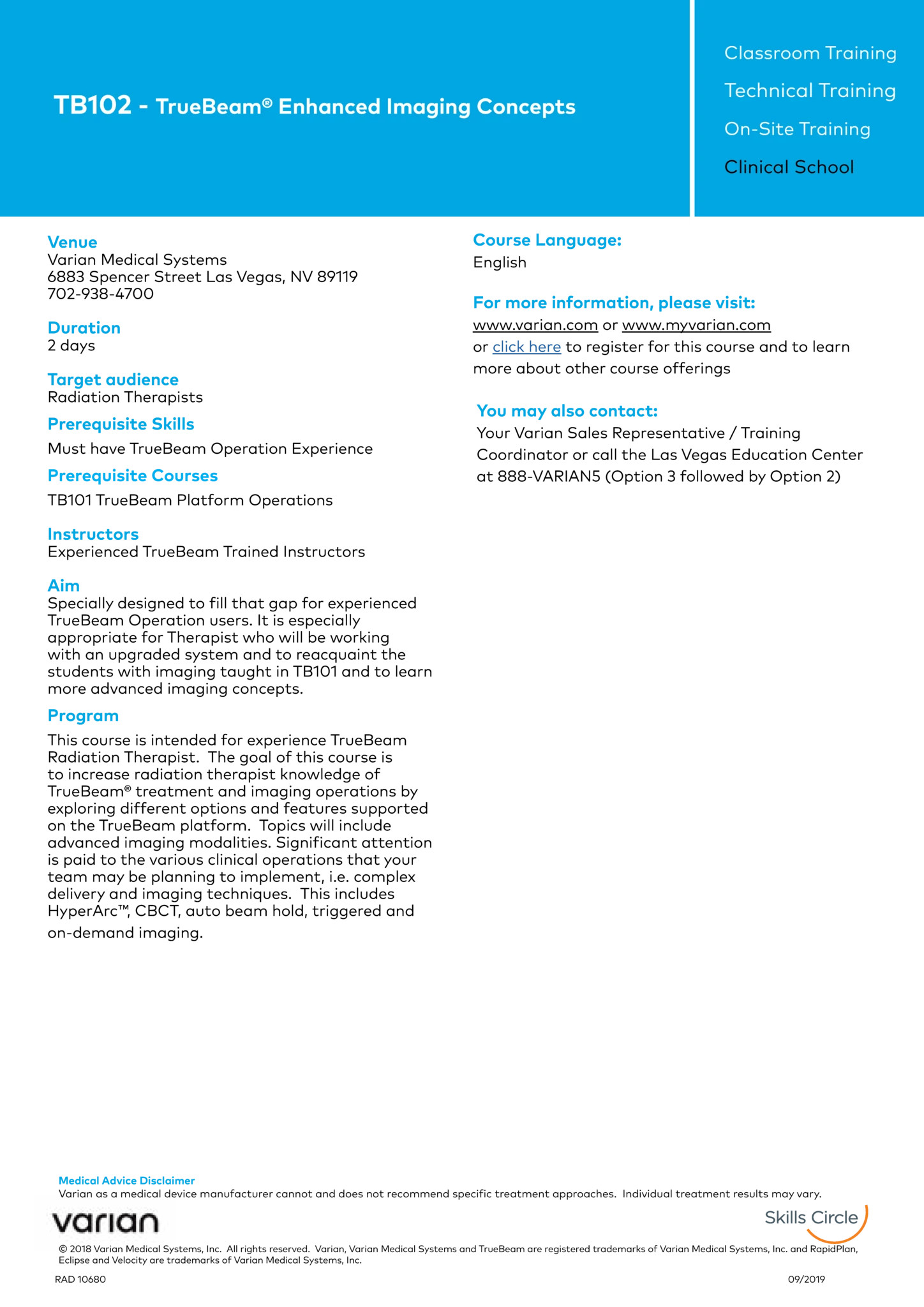 "courseDescription": "The goal of this course is to increase radiation therapist knowledge of TrueBeam® treatment and imaging operations by exploring different options and features supported on the TrueBeam platform. Topics will include advanced imaging modalities. Significant attention is paid to the various clinical operations that your team may be planning to implement, i.e. complex delivery and imaging techniques. This includes HyperArc™, CBCT, auto beam hold, triggered and on-demand imaging. PREREQUISITE: The intended audience for this course is EXPERIENCED TrueBeam Radiation Therapists",