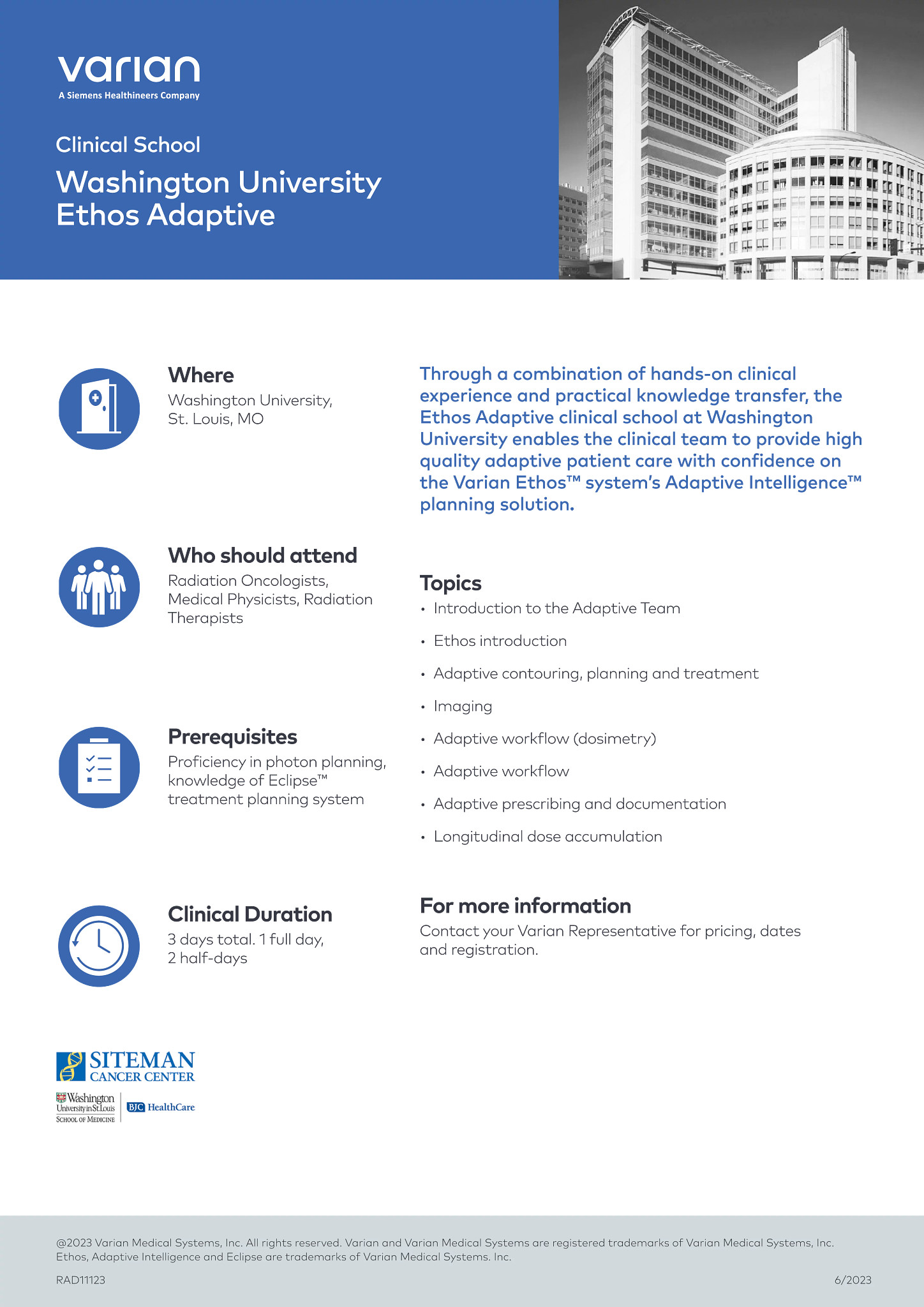 Through a combination of hands-on clinical experience and practical knowledge transfer, the Ethos Adaptive clinical school at Washington University enables the clinical team to provide high quality adaptive patient care with confidence on the Varian Ethos™ system’s Adaptive Intelligence™ planning solution.