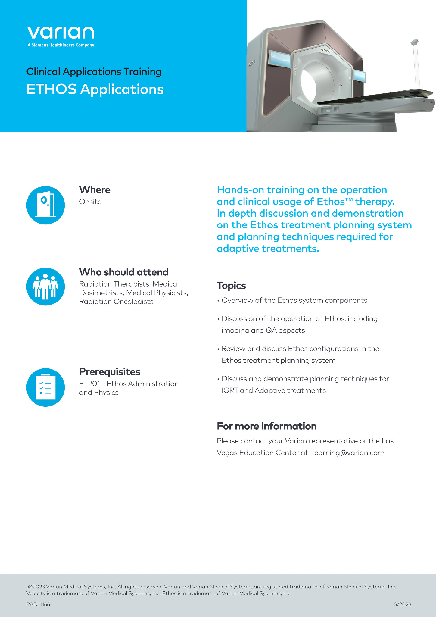 Hands-on training on the operation and clinical usage of Ethos™ therapy. In depth discussion and demonstration on the Ethos treatment planning system and planning techniques required for adaptive treatments.