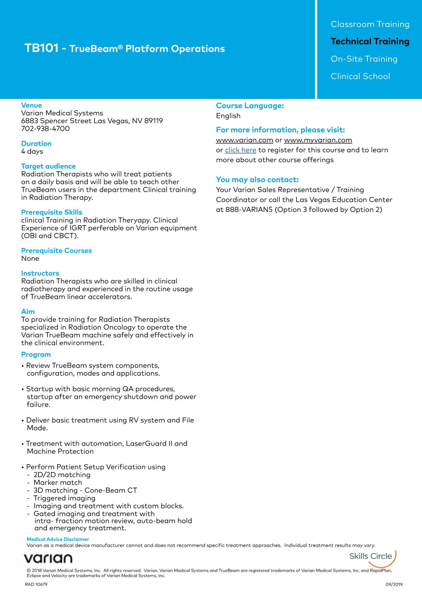 This course provides training for Radiation Therapists responsible for the operation of the TrueBeam, providing an overview of the TrueBeam system, hands-on training to include: system components, shutdown procedure, startup with basic morning QA procedures, startup after an emergency shutdown and power failure, basic administrative information and treatment and imaging scenarios to include: basic 2D and 2D-2D imaging, treatment with automation, LaserGuard II and Machine Protection, imaging and treatment with custom blocks, Cone-Beam CT , gated imaging and treatment with intra-fraction motion review, auto-beam hold and emergency treatment.