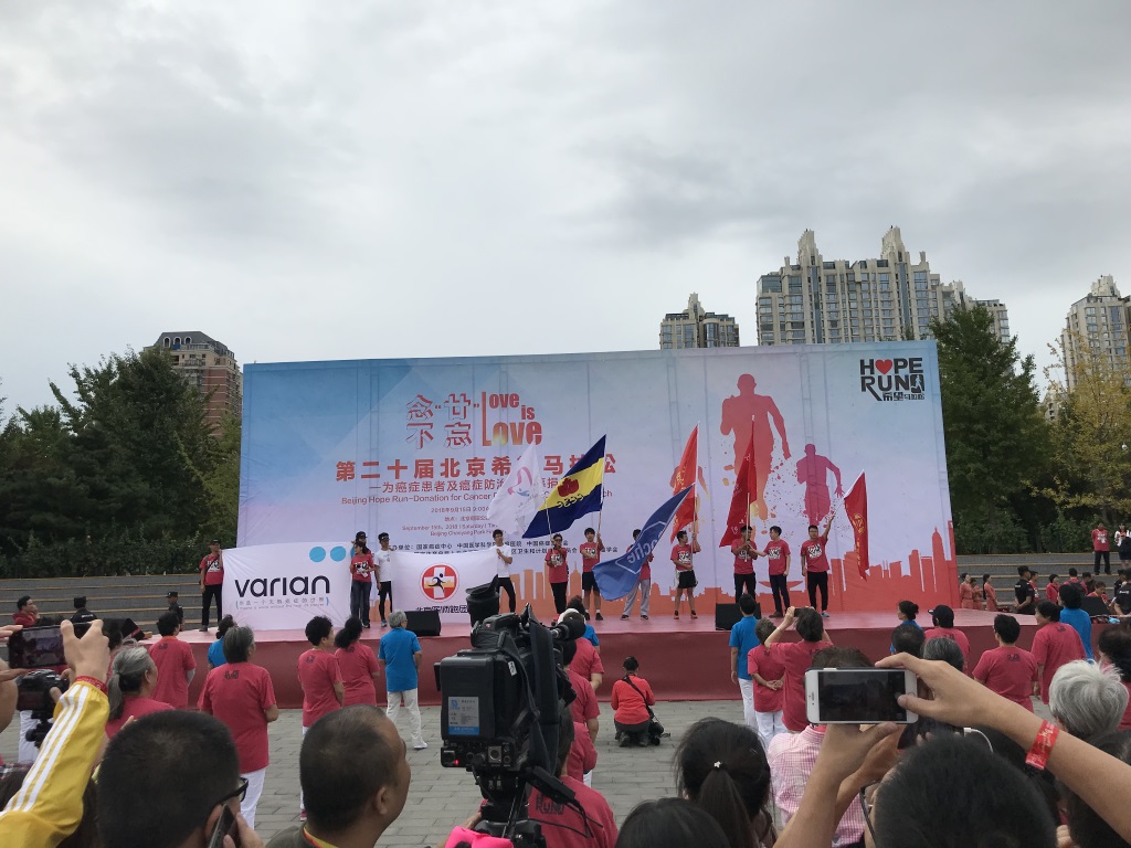 2018年9月15日上午,以“念‘廿’不忘 Love is love”为主题, “第二十届北京希望马拉松——为癌症患者及癌症防治研究募捐义跑”在朝阳公园鸣笛开跑,抗癌先锋军瓦里安的员工们和家属们也参与其中,为希望奔跑。