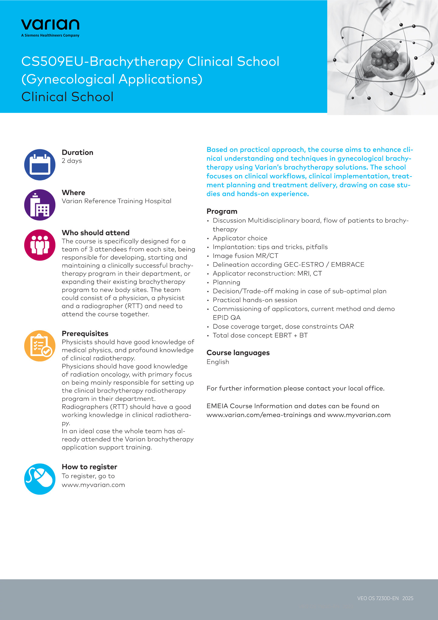 Based on practical approach, the course aims to enhance clinical understanding and techniques in gynecological brachytherapy using Varian’s brachytherapy solutions. The school focuses on clinical workflows, clinical implementation, treatment planning and treatment delivery, drawing on case studies and hands-on experience.
