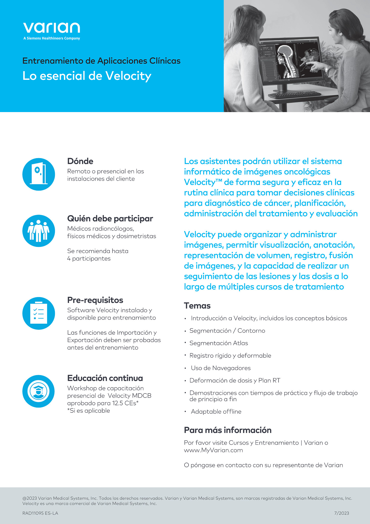 "courseDescription": "Los asistentes podrán utilizar el sistema informático de imágenes oncológicas Velocity™ de forma segura y eficaz en la rutina clínica para tomar decisiones clínicas para diagnóstico de cáncer, planificación, administración del tratamiento y evaluación.