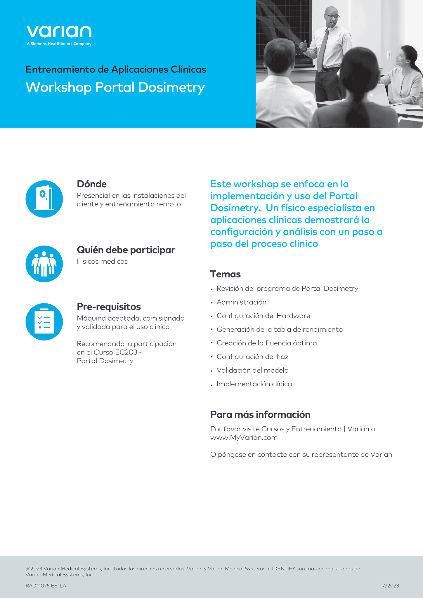 Este workshop se enfoca en la implementación y uso del Portal Dosimetry. Un físico especialista en aplicaciones clínicas demostrará la configuración y análisis con un paso a paso del proceso clínico.