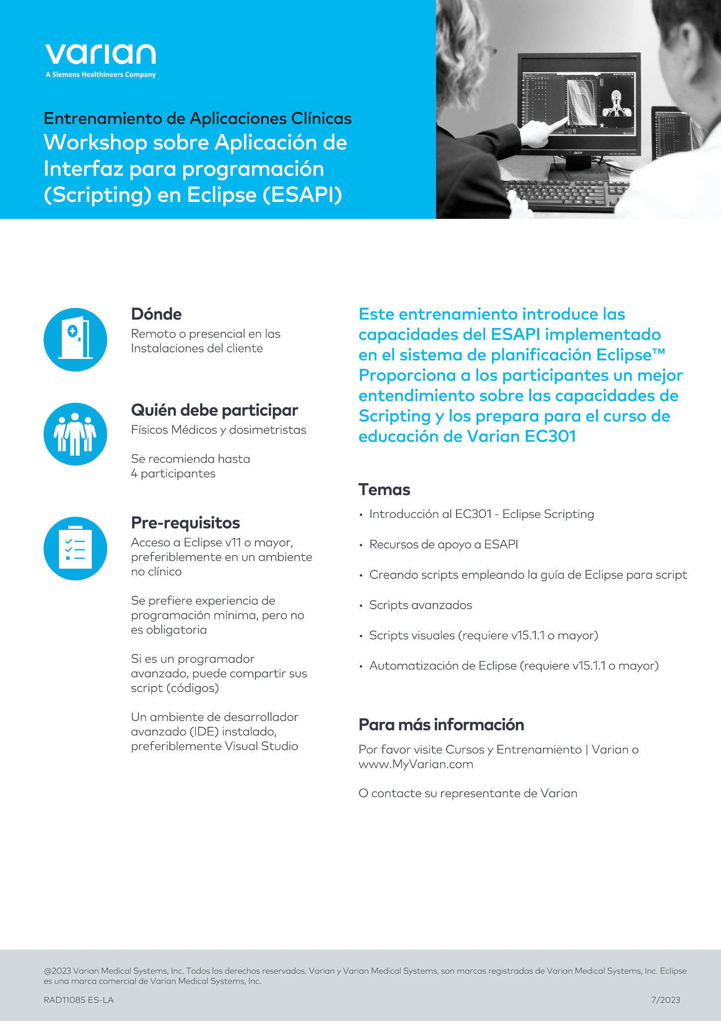 Este entrenamiento introduce las capacidades del ESAPI implementado en el sistema de planificación Eclipse™ Proporciona a los participantes un mejor entendimiento sobre las capacidades de Scripting y los prepara para el curso de educación de Varian EC301.