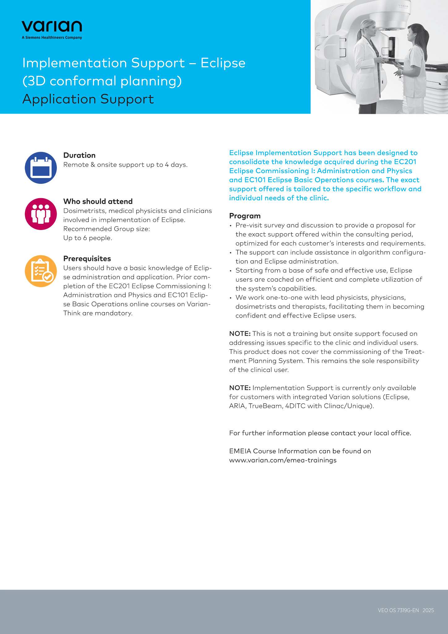 Eclipse Implementation Support has been designed to consolidate the knowledge acquired during the EC201 Eclipse Commissioning I: Administration and Physics and EC101 Eclipse Basic Operations courses. The exact support offered is tailored to the specific workflow and individual needs of the clinic.