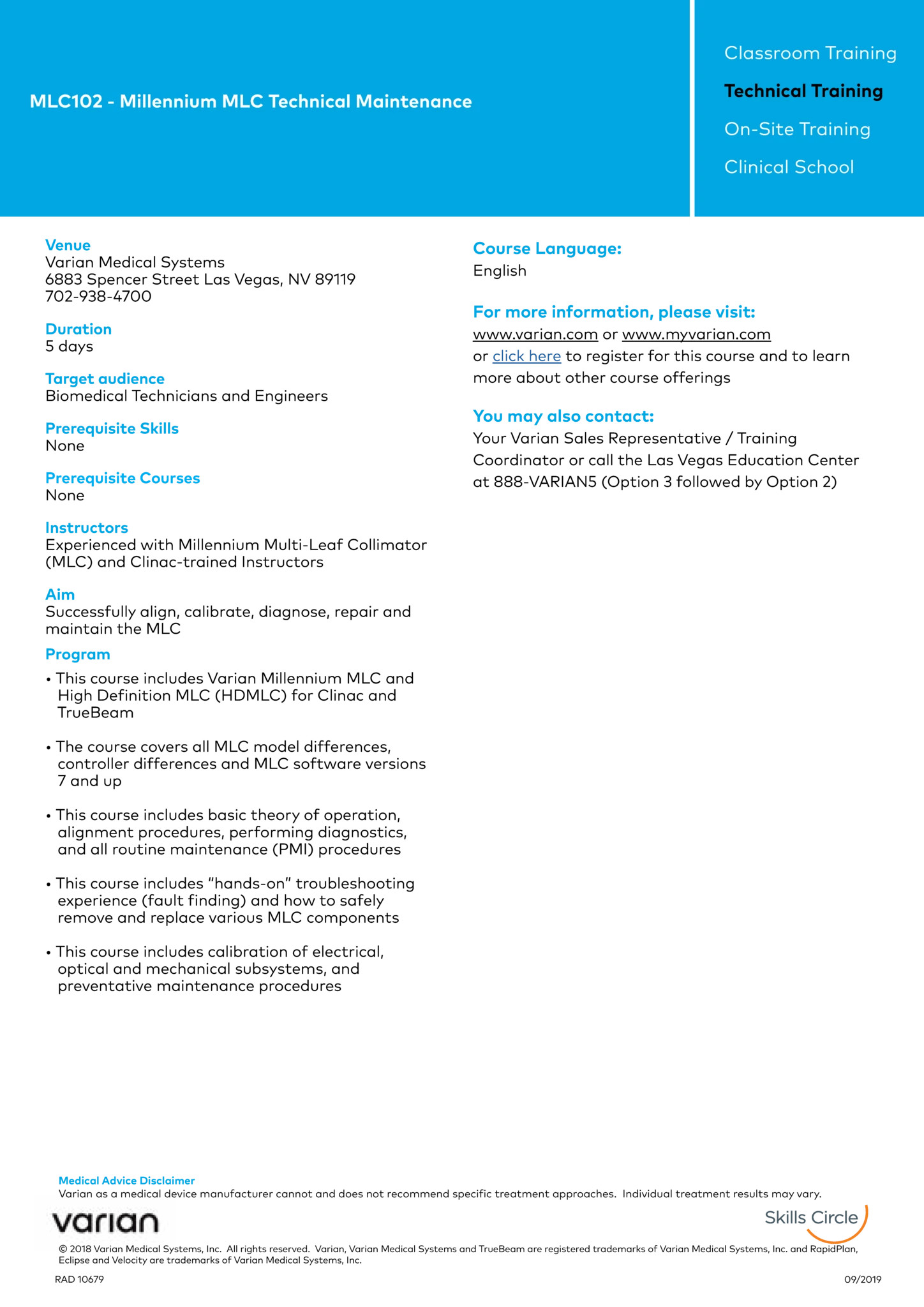 { "pageType": "course-page", "courseTitle": "MLC102 MLC HDMLC Technical Maintenance", "courseTimeZone": "Las Vegas NV", "courseRegion": "americas", "courseTrainingType": "classroom", "courseDescription": "This course will cover the entire Millennium series of Varian Multi-Leaf Collimators and all versions of the High Definition MLC (HDMLC) on both Clinac and Truebeam platform. includes basic theory of operation, alignment procedures, performing diagnostics, and all routine maintenance (PMI) procedures and  troubleshooting experience (fault finding) • Practice safely removing and replacing various MLC components.  ", "recommendedFor": "BioMed Technicians", "courseCode": "", "courseUnavailable": "false", }