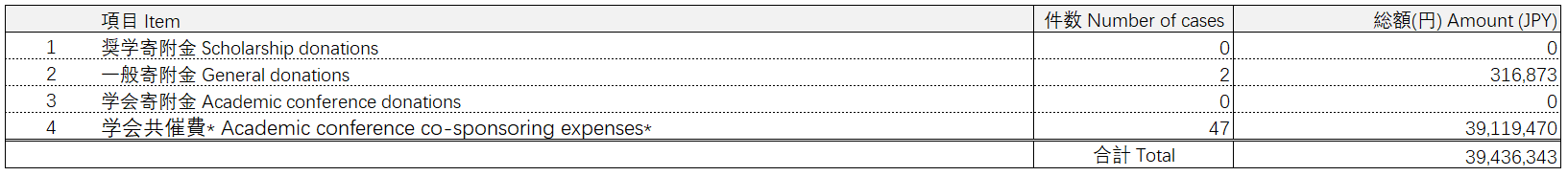 医療技術の学術振興や研究助成を目的として行われる奨学寄附金、一般寄附金、および学会等の会合開催を支援するための学会寄附金、学会共催費が含まれます。