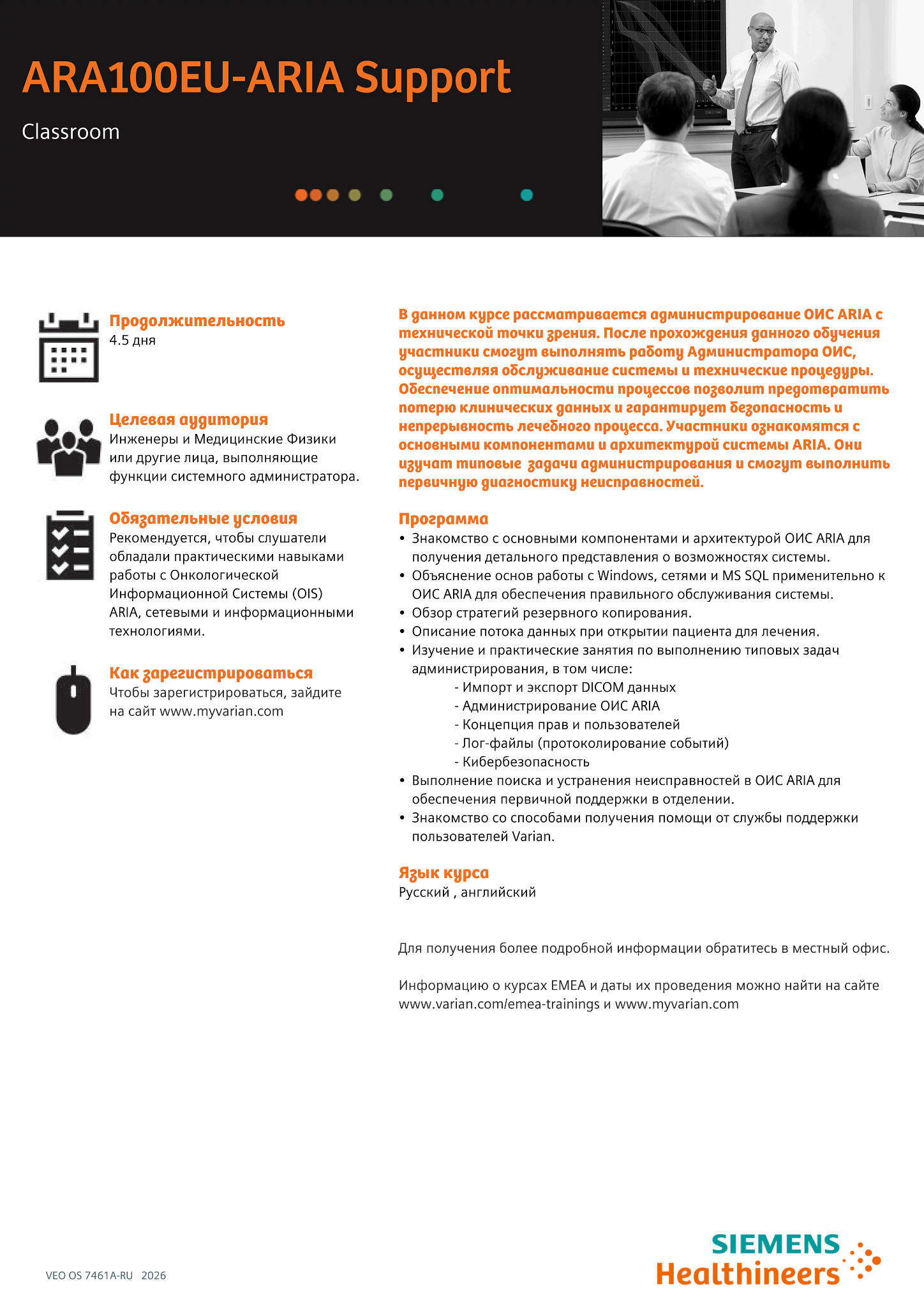 В данном курсе рассматривается администрирование ОИС ARIA с технической точки зрения. После прохождения данного обучения участники смогут выполнять работу Администратора ОИС, осуществляя обслуживание системы и технические процедуры. Обеспечение оптимальности процессов позволит предотвратить потерю клинических данных и гарантирует безопасность и непрерывность лечебного процесса. Участники ознакомятся с основными компонентами и архитектурой системы ARIA. Они изучат типовые задачи администрирования и смогут выполнить первичную диагностику неисправностей.