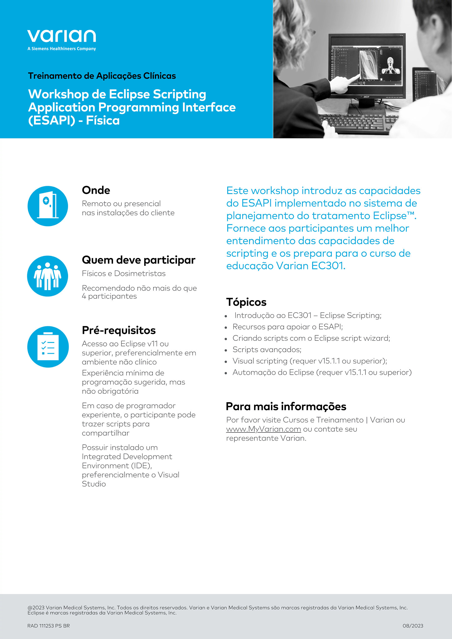 Este workshop introduz as capacidades do ESAPI implementado no sistema de planejamento do tratamento Eclipse™. Fornece aos participantes um melhor entendimento das capacidades de scripting e os prepara para o curso de educação Varian EC301.