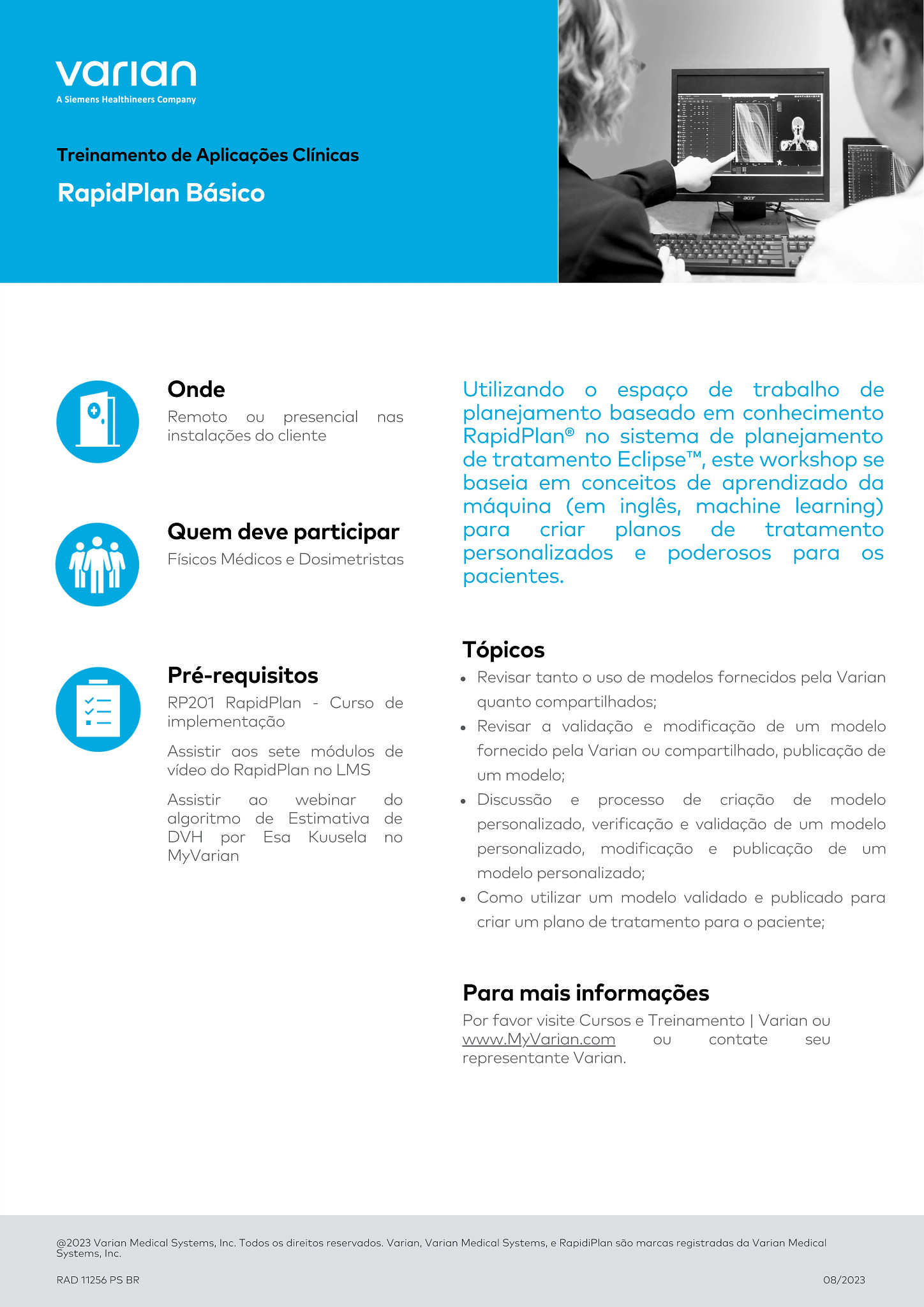 Utilizando o espaço de trabalho de planejamento baseado em conhecimento RapidPlan® no sistema de planejamento de tratamento Eclipse™, este workshop se baseia em conceitos de aprendizado da máquina (em inglês, machine learning) para criar planos de tratamento personalizados e poderosos para os pacientes.