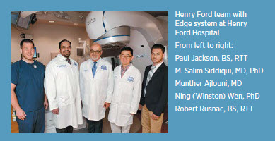 Researchers at Henry Ford Health System were part of the team, along with CCU, that substantiated the accuracy of the Edge system. The Henry Ford Health System, based in Detroit, Michigan, has a wealth of experience in delivering stereotactic radiation treatment. Over approximately 15 years, Henry Ford has treated more than 4,500 patients with stereotactic radiation; more than a third have been spine radiosurgery cases. In addition, they have considerable experience in stereotactic body radiation therapy (SBRT) for tumors of the lung, pancreas, adrenal glands, and other sites that are not amenable to surgery or conventional radiation treatment. Today, the radiosurgery system that Henry Ford relies on most for stereotactic procedures is the Edge.