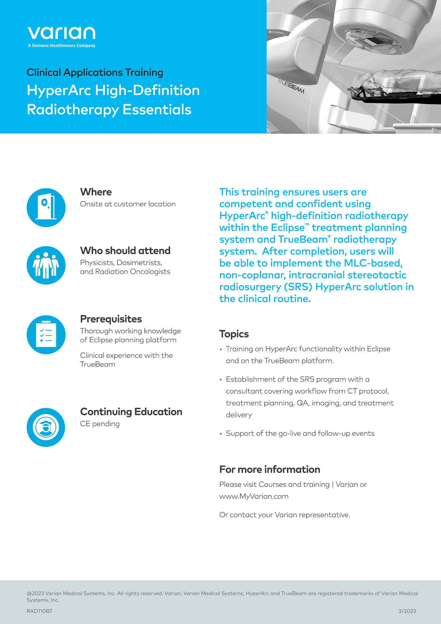 "courseDescription": "This training ensures users are competent and confident using HyperArc® high-definition radiotherapy within the Eclipse™ treatment planning system and TrueBeam® radiotherapy system. After completion, users will be able to implement the MLC-based, non-coplanar, intracranial stereotactic radiosurgery (SRS) HyperArc solution in the clinical routine.",