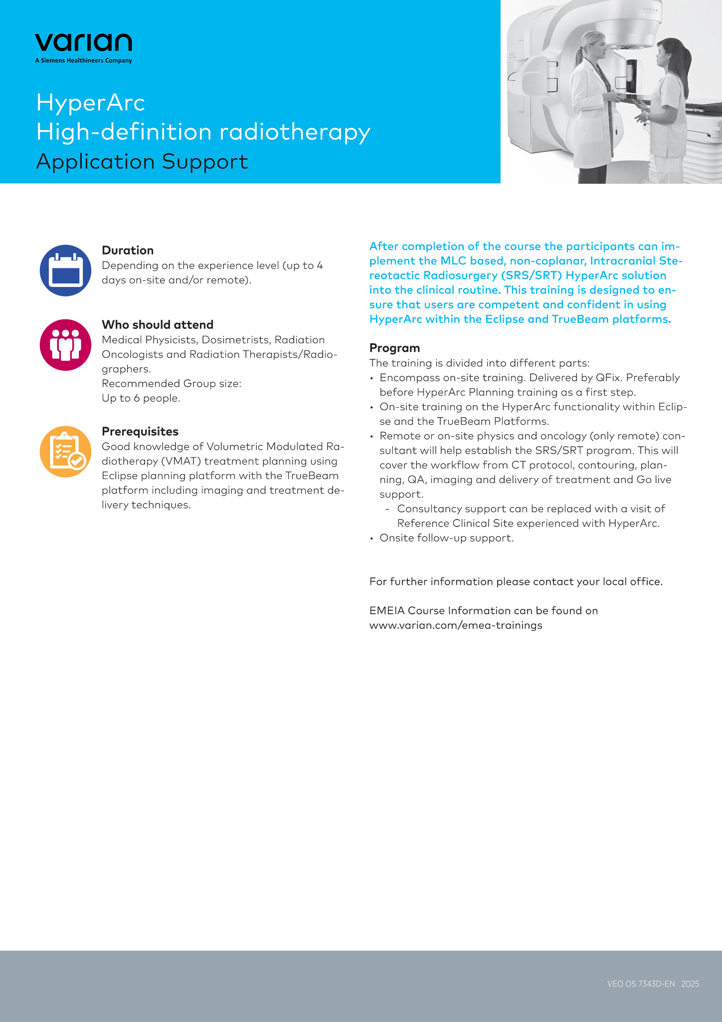 After completion of the course the participants can implement the MLC based, non-coplanar, intracranial Stereotactic radiosurgery (SRS) HyperArc solution into the clinical routine. This training is designed to ensure that users are competent and confident in using HyperArc within the Eclipse and TrueBeam platform.
